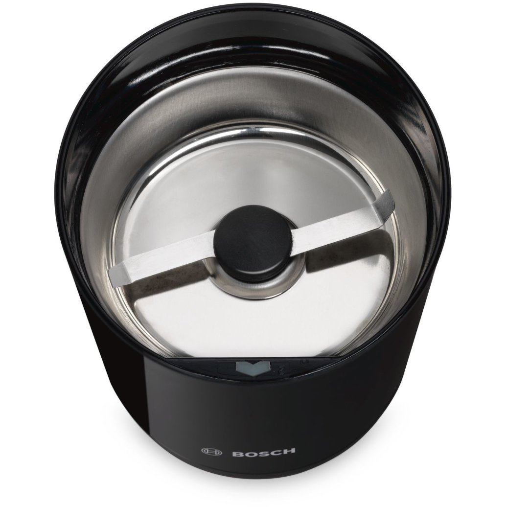 Die Bosch Kaffeemühle Schwarz überzeugt mit einem leistungsstarken 180-Watt-Motor, der mühelos Kaffeebohnen mit seinem robusten Schlagmesser zerkleinert. Mit einem Fassungsvermögen von 75 g können Sie genug Bohnen für mehrere Tassen frisch gemahlenen Kaffee mahlen, wann immer Sie möchten.