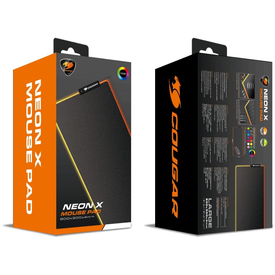 COUGAR Gaming Gaming Mauspad NEON X, ARGB, 800x300. Breite: 300 mm, Tiefe: 800 mm. Produktfarbe: Schwarz, Oberfl„chenf„rbung: Einfarbig, Material: Stoff, Gummi, Farbe der Hintergrundbeleuchtung: verschiedene, Gestickte Kanten, Anti-Rutsch-Basis, Gaming-Mauspad
