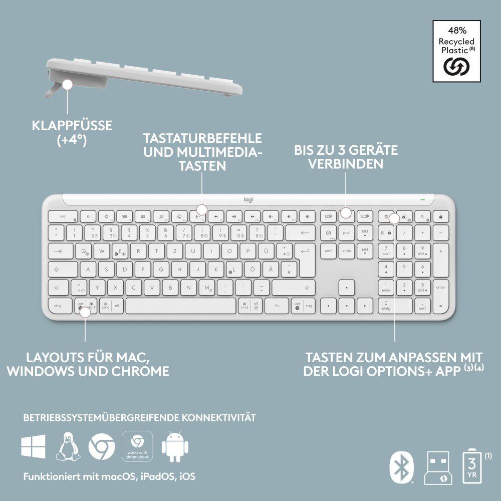 Logitech Signature Slim Combo MK950. Tastatur Formfaktor: Volle Größe (100%). Tastatur-Stil: Gerade. Übertragungstechnik: Kabellos, Geräteschnittstelle: RF Wireless + Bluetooth, Tastatur-Switch: Scherenschalter, Tastaturaufbau: QWERTZ, Empfohlene Nutzung: Büro. Produktfarbe: Weiß. Maus enthalten