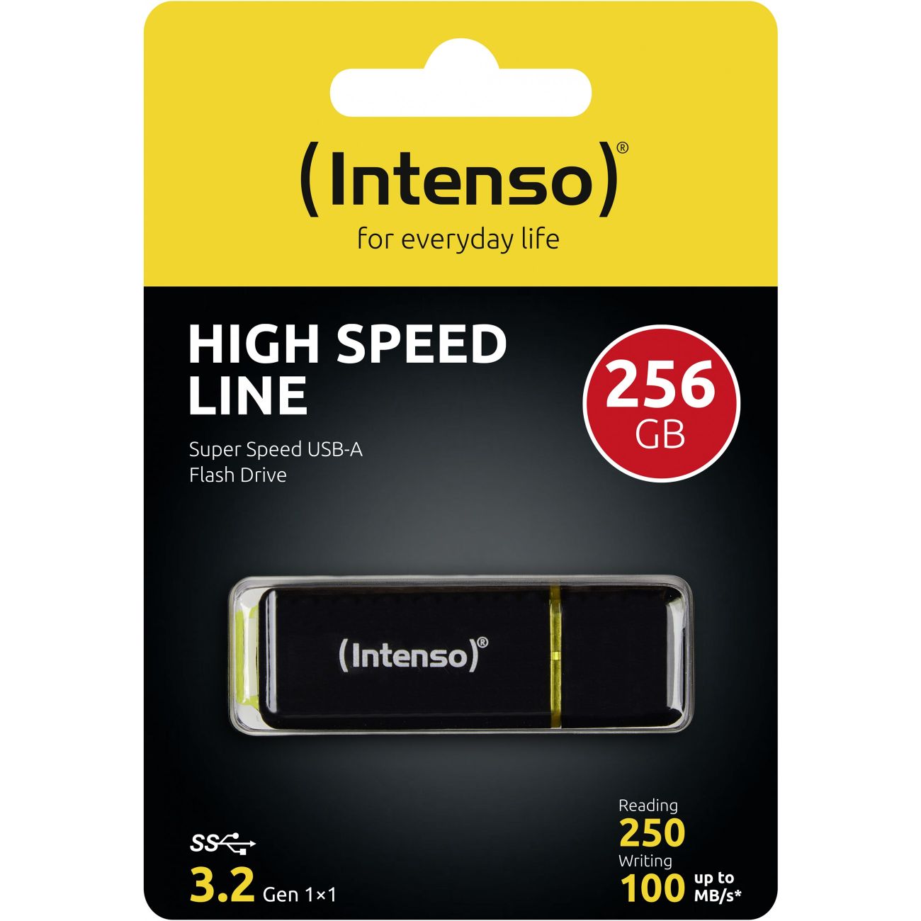 Intenso High Speed Line. Kapazität: 256 GB, Geräteschnittstelle: USB Typ-A, USB-Version: 3.2 Gen 1 (3.1 Gen 1), Lesegeschwindigkeit: 250 MB/s, Schreibgeschwindigkeit: 100 MB/s. Formfaktor: Kappe. Gewicht: 6 g. Produktfarbe: Schwarz, Gelb