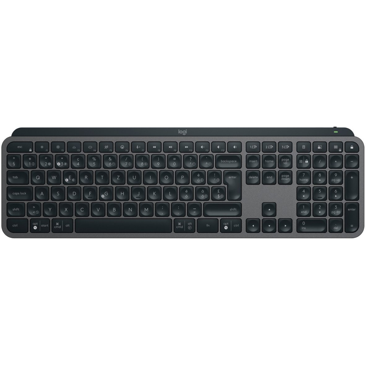 Logitech Master MX Keys Combo for Bussiness. Tastatur Formfaktor: Volle Größe (100%). Tastatur-Stil: Gerade. Übertragungstechnik: Kabellos, Geräteschnittstelle: RF Wireless + Bluetooth, Tastatur-Switch: Scherenschalter, Tastaturaufbau: QWERTZ, Tastatur - Tastenanzahl: 108. Typ der Hintergrundbeleuchtung: LED, Handgelenkauflage. Kabellänge: 1,3 m. Empfohlene Nutzung: Büro. Produktfarbe: Graphit. Maus enthalten