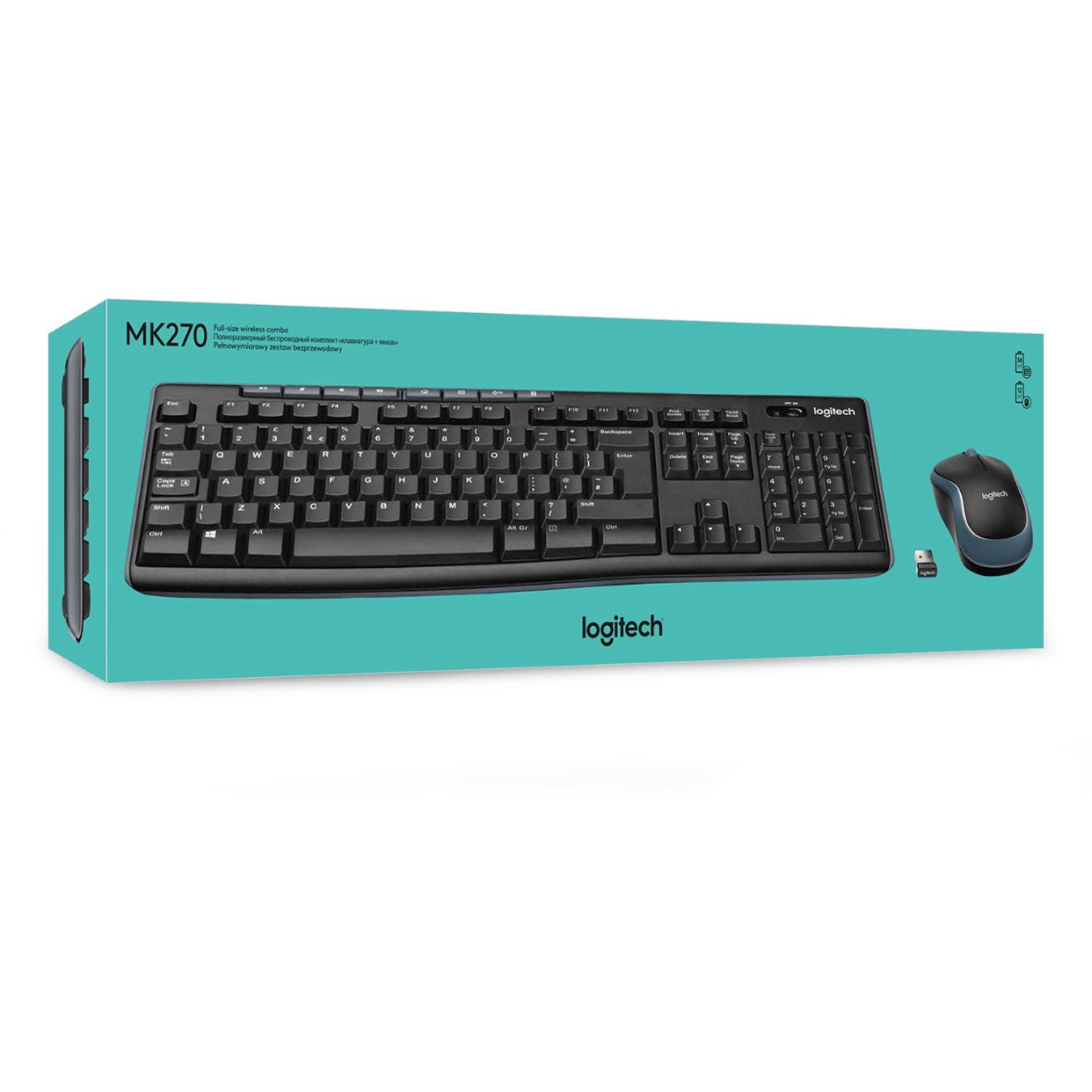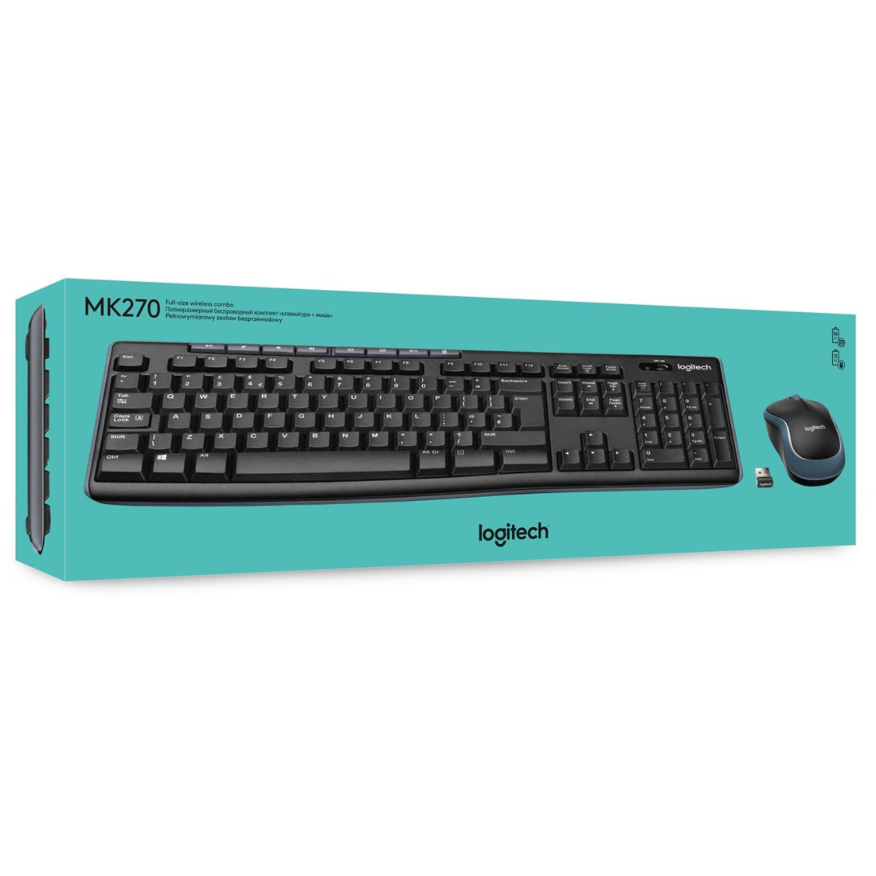 Logitech MK270. Tastatur Formfaktor: Volle Größe (100%). Tastatur-Stil: Gerade. Übertragungstechnik: Kabelgebunden, Geräteschnittstelle: RF Wireless, Tastaturaufbau: AZERTY, Tastatur - Tastenanzahl: 111, Empfohlene Nutzung: Büro. Produktfarbe: Schwarz. Maus enthalten